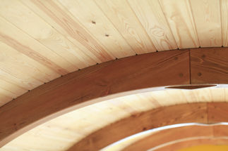 Custom made curved roof beams with a pegged loose tenon detail, lightly stained, with tongue and groove cladding above.